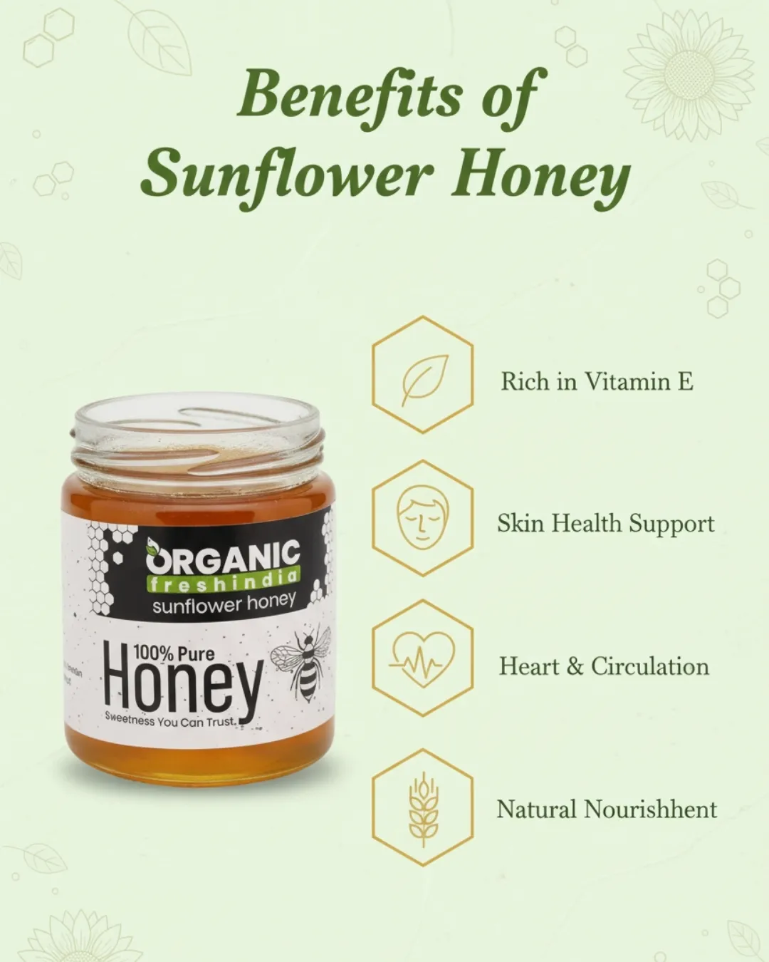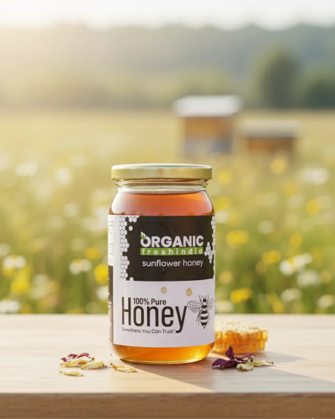 OrganicFreshIndia Sunflower Honey is crafted from the nectar of sun-loving sunflower blooms, giving it a naturally bright, golden hue and a mild, refreshing taste. Known for its light floral sweetness and clean flavor profile, sunflower honey is ideal for those who prefer a gentle but nutritious honey for everyday use.